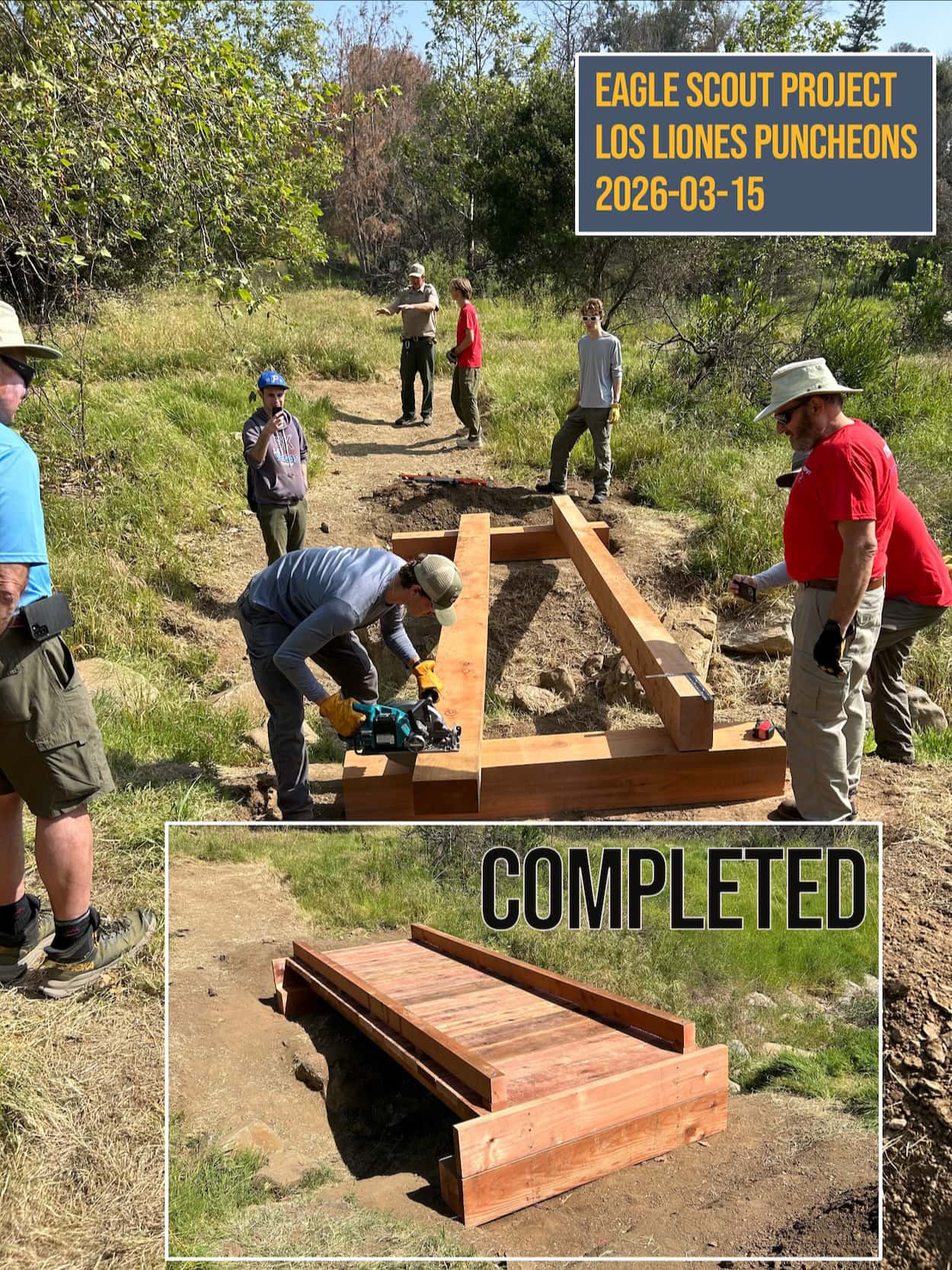 Several months ago, the Trails council entered a collaboration with State Parks to replace five puncheons which were destroyed in the Palisades Fire (January 2025). The plan is to parse the project into five sub-projects, with each sub-project to be implemented as an Eagle Scout Project.