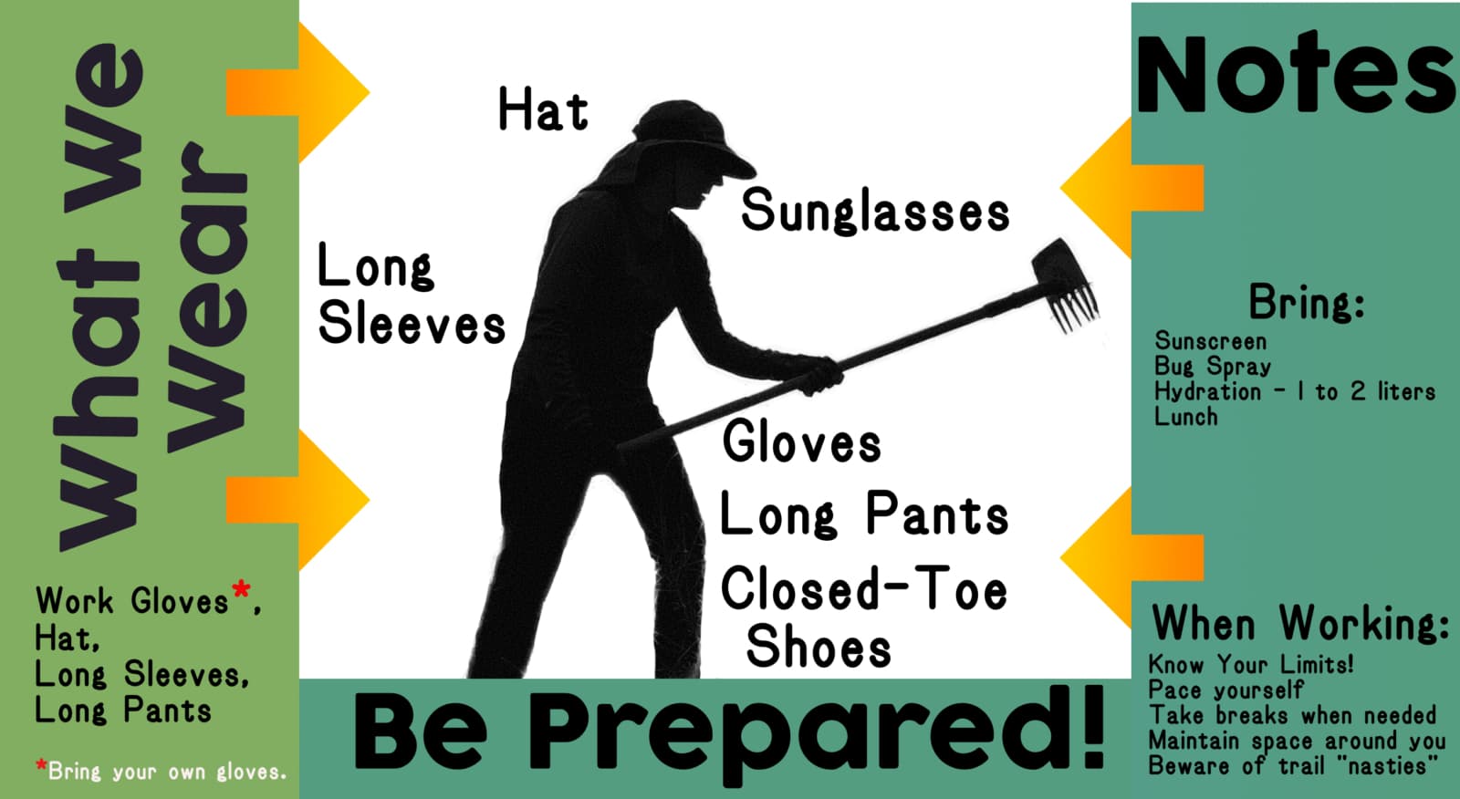 Bring work GLOVES! Tools are provided, but you can bring a pick, shovel, Pulaski, McLeod, pruning saw, or long-handled loppers.