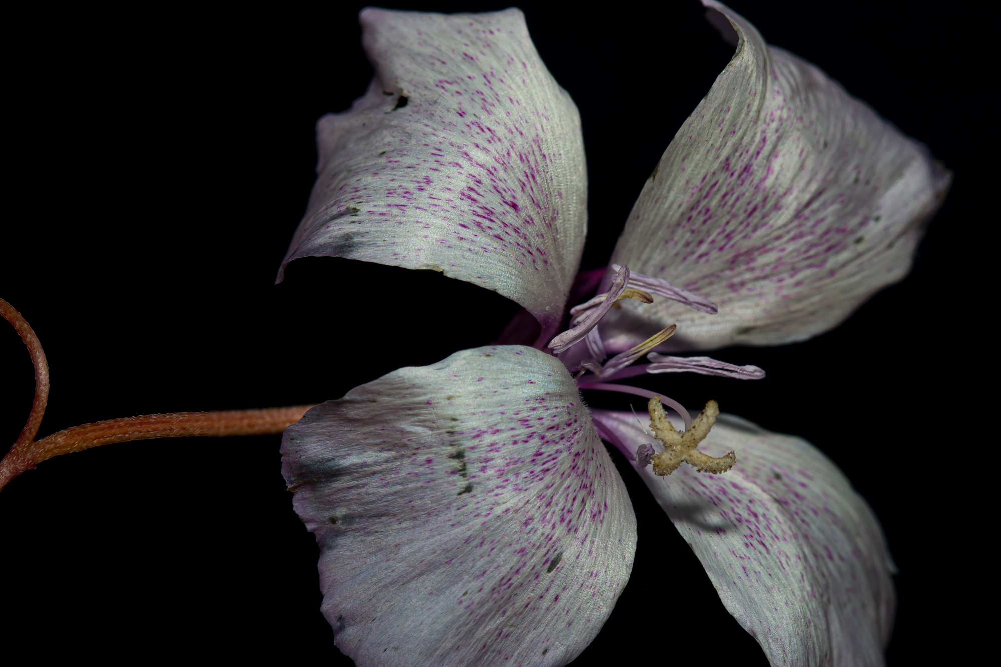 Aptly named, the blooms of Farewell-to-Spring Clarkia bottae - signal that the peak of the Spring bloom is over. The Farewell-to-Spring flower is bowl shaped, pink to lavender in color, often speckled with red and blooms from late April to July (depending on the timing and amount of rain). Botanist use the word pendant to describe how the flower buds hang downward before changing position when the flowers open. You can see this in several of the images. The stigma protrudes from the corolla and is surrounded by shorter stamens. I found it fascinating to watch the stigma change over time from an orb like structure to a fuzzy nearly 'plus'- like structure. Clarkia bottae grows on spindly stems and and is sparsely outfitted with narrow leaves.