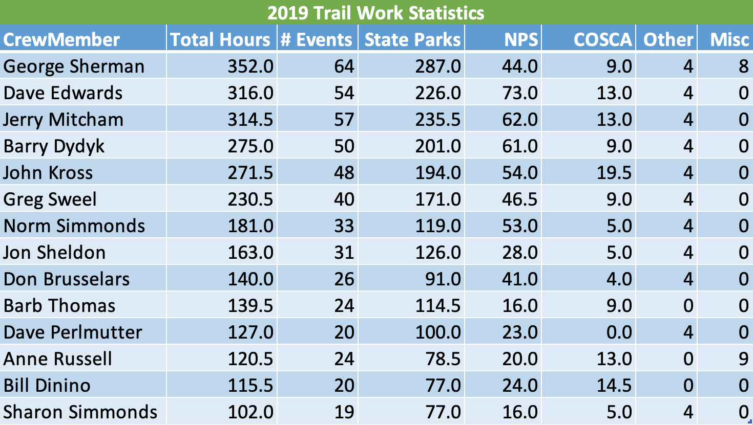 Our Rookie of the year award goes to Jon Sheldon - who put in 163 hours of volunteer labor during 2019. One Saturday, during 2019, Jon showed up to work. He worked hard and kept coming back. Before we knew it, it was like Jon had always been working with us. We are delighted that Jon has found a place amongst our hard working and dedicated trail workers!
